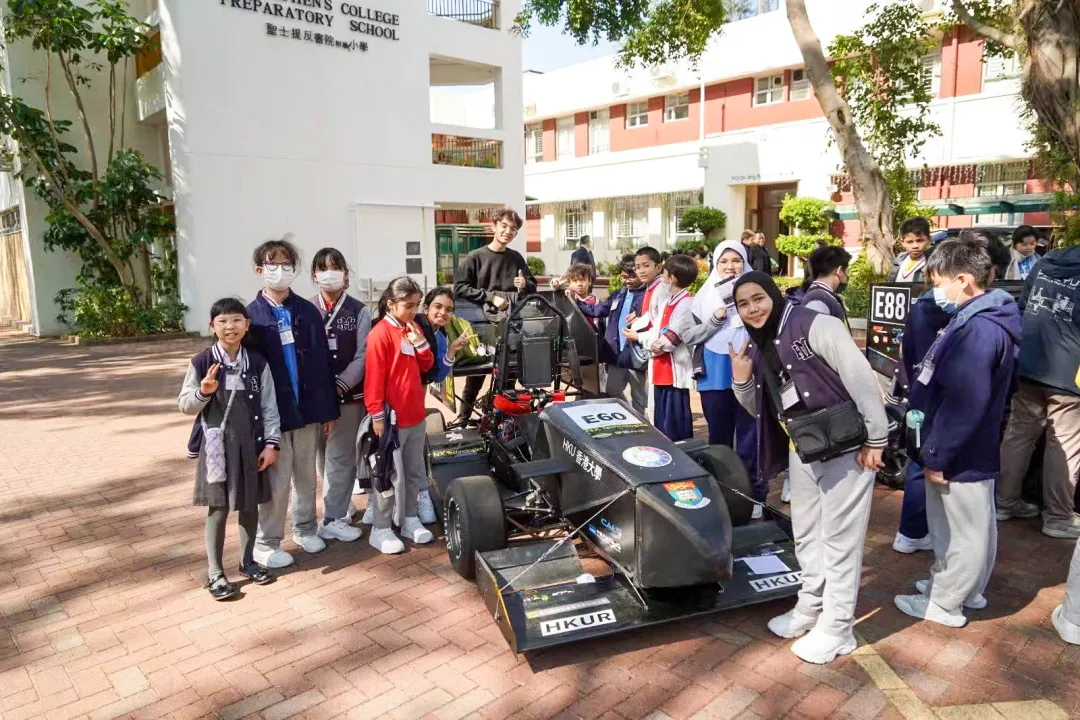 香港大学和香港理工大学电动方程式车队赛车开进校园,介绍车队及赛车发展,解说赛车设计理念与独特之处,细致拆解赛车设计理念与三电系统、碳纤维车身等核心零件的功能及作用。孩子们围站赛车旁,满眼好奇与惊叹,俯身观察细节,聆听讲解,心中的科技探索热情被极速点燃,对赛车科技与速度魅力充满无限向往。